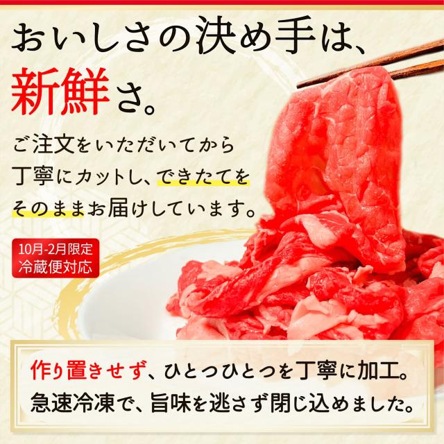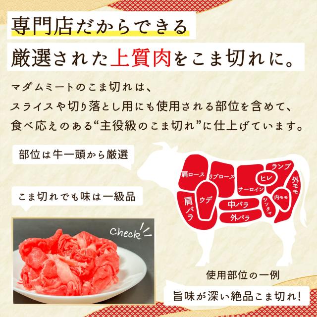 厳選された国産牛のこま切れ肉で、柔らかな食感と旨みを存分にご堪能いただけます。