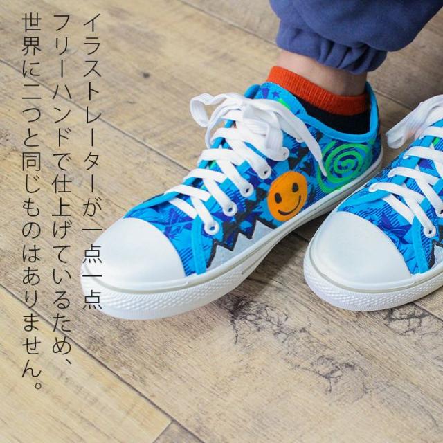 自由な感性で描かれた、ハッピーな雰囲気溢れるハンドペイントスニーカーが登場。 イラストレーターが一点一点フリーハンドで仕上げているため、世界に二つと同じものはありません。自分だけの「一点物」を持つ喜びを感じられる特別な一足です。