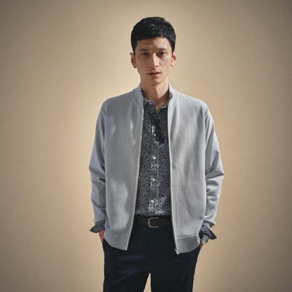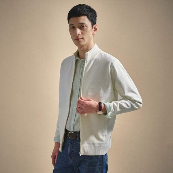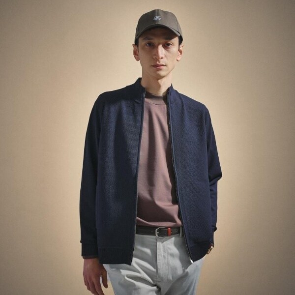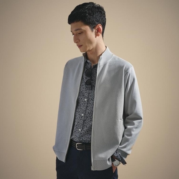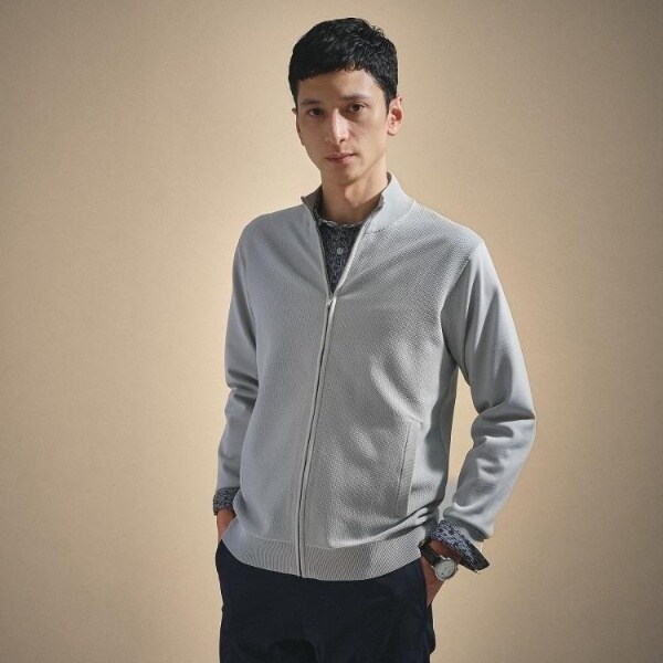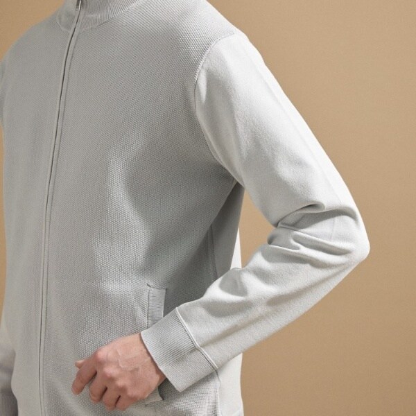 もっちりとした弾力と、しっとり肌に寄り添うタッチが心地よいジップアップニット。