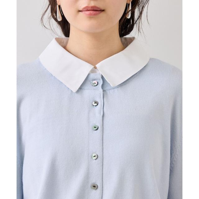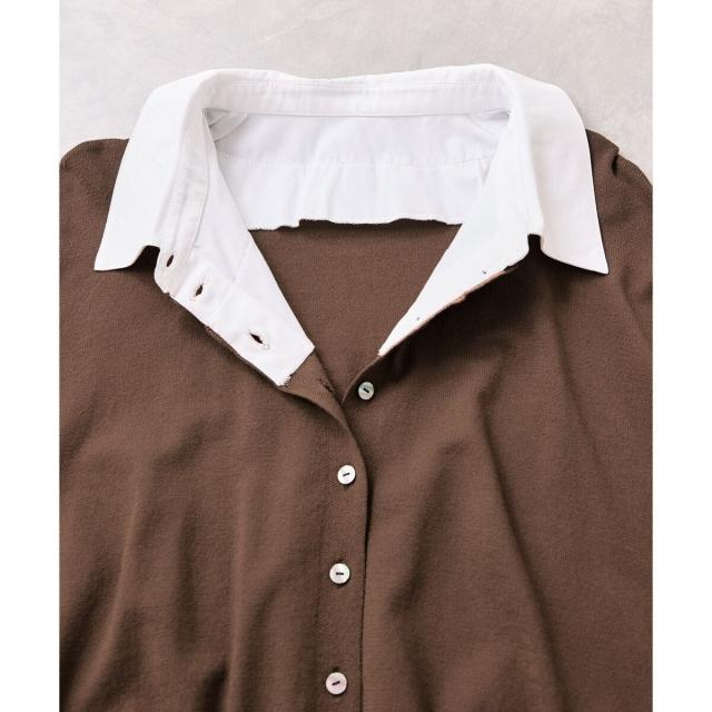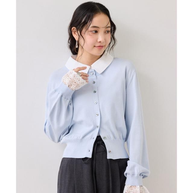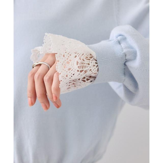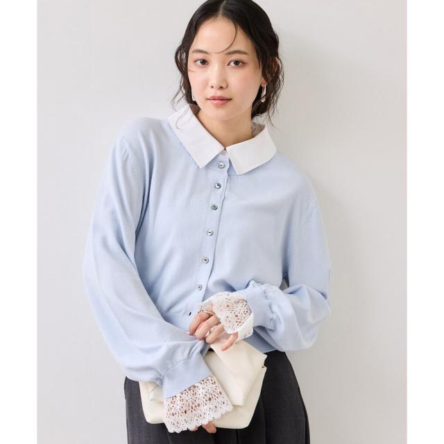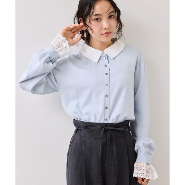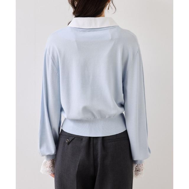 1枚でスタイリングが完成させるシャツ襟とレース袖がドッキングされているニットトップス。