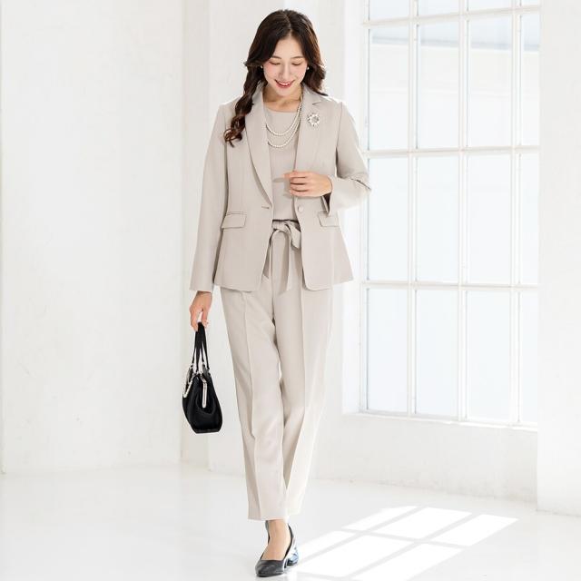 きめの細かいドビー生地の、ジャケット・ブラウス・パンツ3点セットのスリーピースセットスーツです。