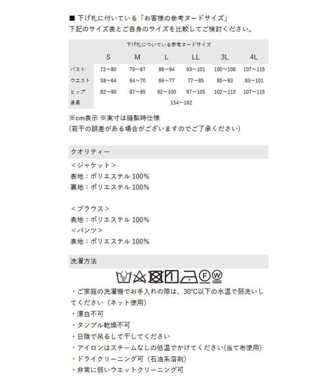 ■素材:【ジャケット】表地:ポリエステル100% 裏地:ポリエステル100%、【ブラウス】表地:ポリエステル100%、【パンツ】表地:ポリエステル100%