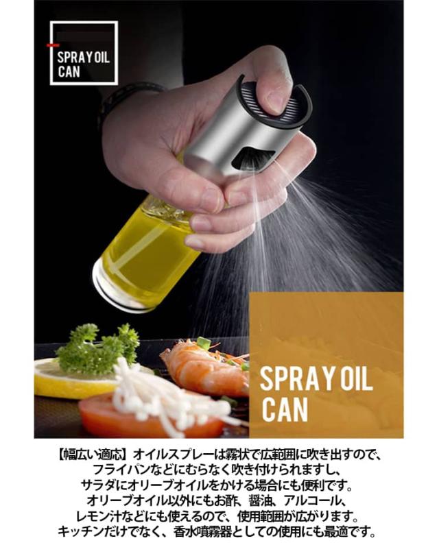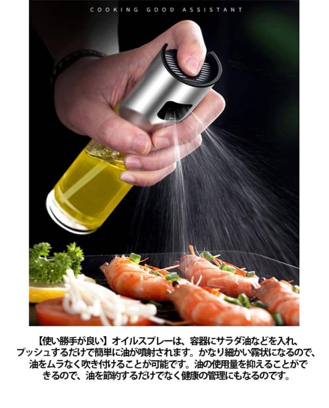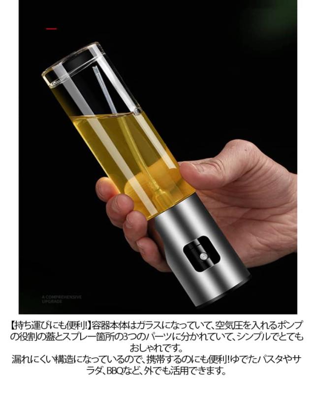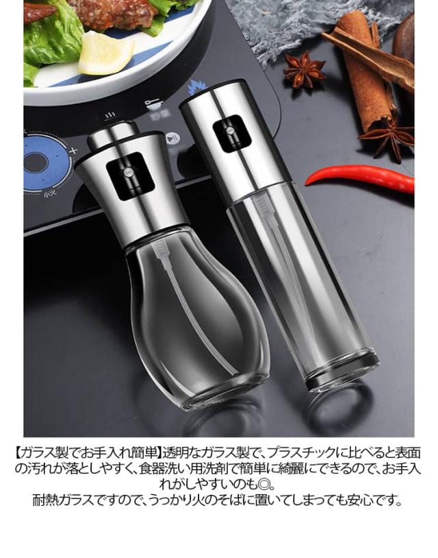 | 【使い勝手が良い】オイルスプレーは、容器にサラダ油などを入れ、プッシュするだけで簡単に油が噴射されます。かなり細かい霧状になるので、油をムラなく吹き付けることが可能です。油の使用量を抑えることができるので、油を節約するだけでなく健康の管理にもなるのです。 【幅広い適応】オイルスプレーは霧状で広範囲に吹き出すので、フライパンなどにむらなく吹き付けられますし、サラダにオリーブオイルをかける場合にも便利です。オリーブオイル以外にもお酢、醤油、アルコール、レモン汁などにも使えるので、使用範囲が広がります。キッチンだけでなく、香水噴霧器としての使用にも最適です。 【ガラス製でお手入れ簡単】透明なガラス製で、プラスチックに比べると表面の汚れが落としやすく、食器洗い用洗剤で簡単に綺麗にできるので、お手入れがしやすいのも◎。耐熱ガラスですので、うっかり火のそばに置いてしまっても安心です。 【持ち運びにも便利!】容器本体はガラスになっていて、空気圧を入れるポンプの役割の蓋とスプレー箇所の3つのパーツに分かれていて、シンプルでとてもおしゃれです。漏れにくい構造になっているので、携帯するのにも便利!ゆでたパスタやサラダ、BBQなど、外でも活用できます。 | |