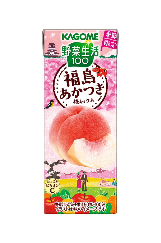 | 季節限定「カゴメ 野菜生活100 福島あかつき桃ミックス」は、福島県の昼夜の寒暖差の中で育つ、しっかりとした甘さと程よい酸味の福島県産のあかつき桃の味わいに仕上げた野菜・果実100%ミックスジュース。 あかつきの名前の由来は、果皮の美しい赤色と、福島の桃の中では早期に収穫できることから「夜明け」という意味を込めて名付けられた説と、福島の伝統行事のひとつである「信夫三山暁まいり」に由来している説などがあります。 ビタミンCをたっぷり含んでおり、朝食のおともやリフレッシュしたいときにおすすめです。 |