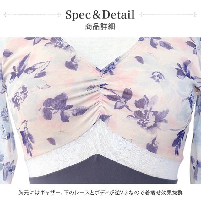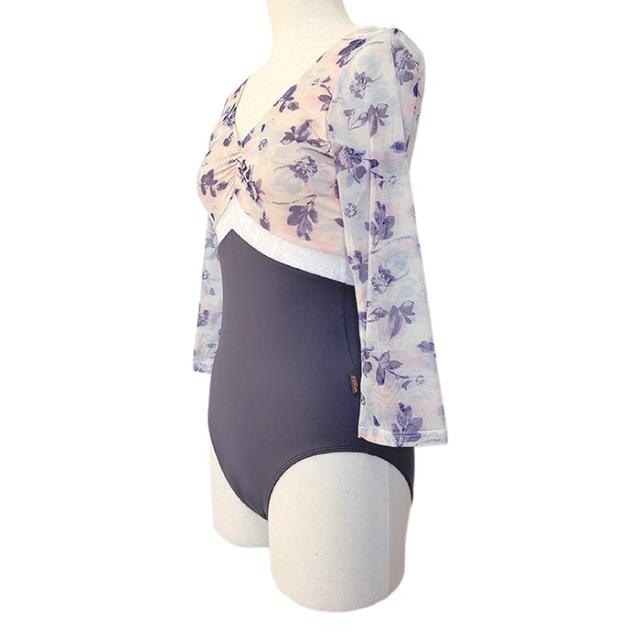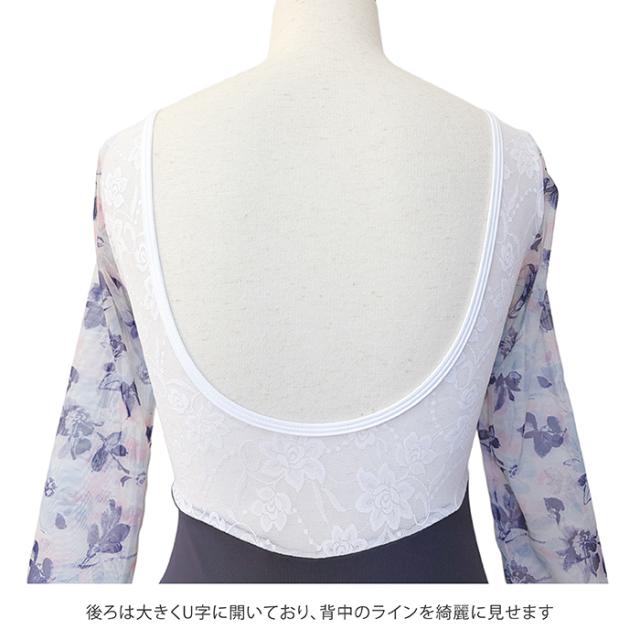 商品名:花柄メッシュ Vネック バイカラー バレエレオタード 7 分袖 ジュニア・大人