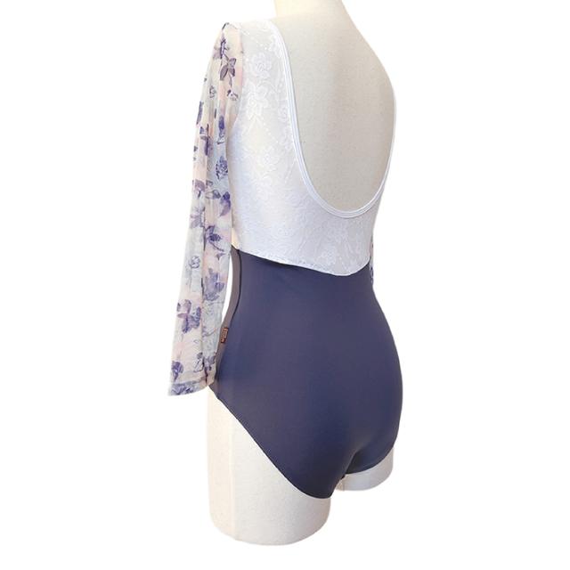 上品な花柄と、落ち着いた色合いのネイビーが美しいレオタード。胸元は大きくVラインで首元をきれいに見せてくれます。 練習着 バレエウェア 紺 おとな デザイン