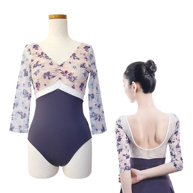 花柄メッシュ Vネック バイカラー バレエレオタード 7分袖 ジュニア・大人