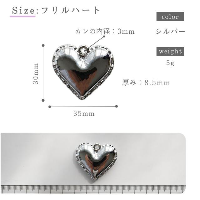 フリルハート:約35mm×30mm 厚み:約8.5mm カンの内径:約3mm