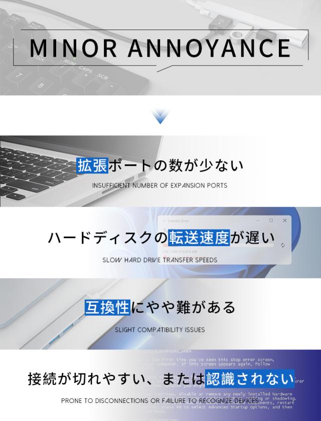 この4-in-1 USB-C拡張ハブは、現代のミニマルで高性能なデジタルデバイスが求める「拡張性」と「携帯性」を両立。ポート不足の悩みを解消し、効率的でスマートなデジタルライフをサポートします。アルミニウムボディの洗練されたデザインは、どんな環境でも調和し、ユーザーのプロフェッショナルなイメージを損ないません。