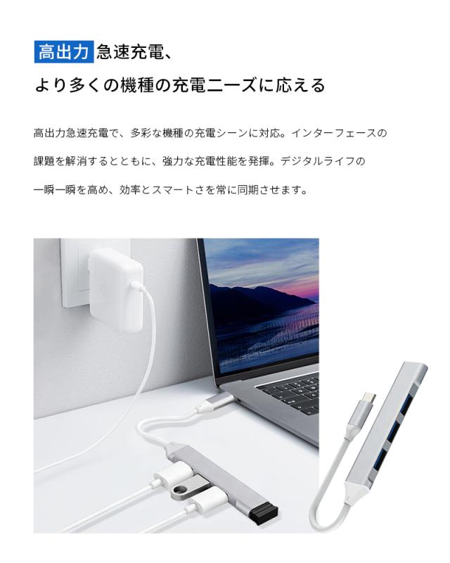 1.本製品は、Type-Cを搭載したMacBookやスマートフォンなどの最新デバイス向けに設計された4-in-1 USB拡張ハブです。わずか83×16×7.2mmの小型ボディに、合計4つのUSB-Aポートを集約。