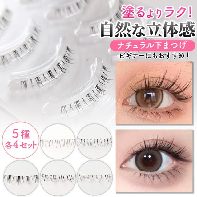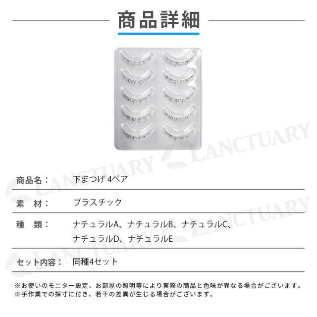 | 主な仕様 | 商品名: 下まつげ 4ペア 種類:ナチュラルA、ナチュラルB、ナチュラルC、 ナチュラルD、ナチュラルE 素材: プラスチック セット内容: 同種4セット |