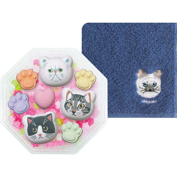 今治製でかわいいニャンコのワンポイント刺繍入りのやわらかな触り心地のハンカチと、カラフルな金平糖と、猫や肉球の形のラムネがセットになりました。ラムネは、伝統菓子・落雁の技術を活かして作られた、和三盆糖入りの上品なお菓子です。カリッと軽やかな食感と、そのあとはふわっと口の中でほどけていく、やさしい口どけ。楽しいおやつタイムになること間違いなしの可愛らしさです。