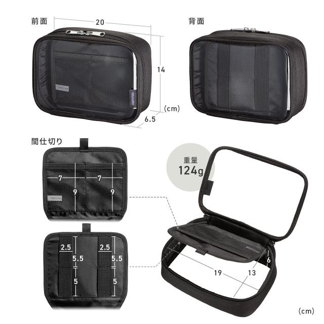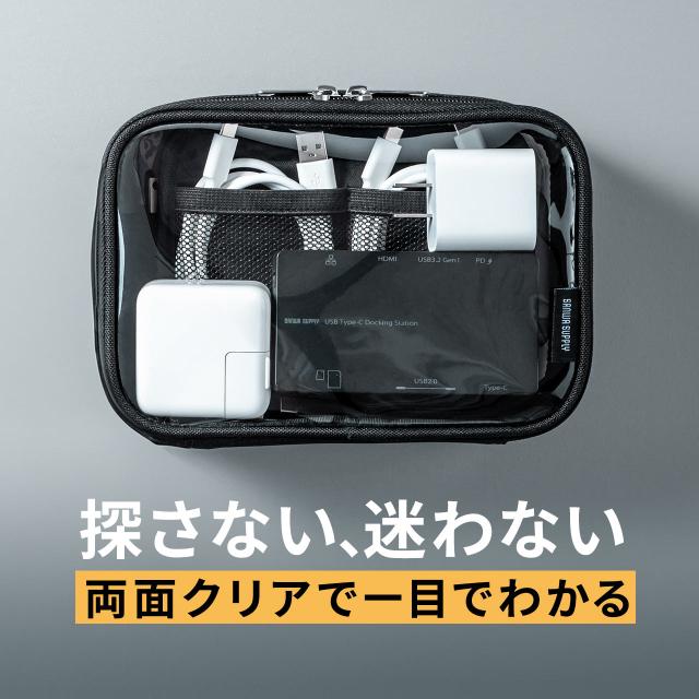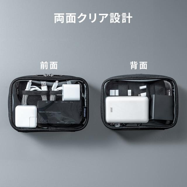 ●クリア素材を使用した中身がわかる、ガジェットケースです。●表裏ともにクリア素材を採用しており、ポーチを開けなくても中身をひと目で確認できます。