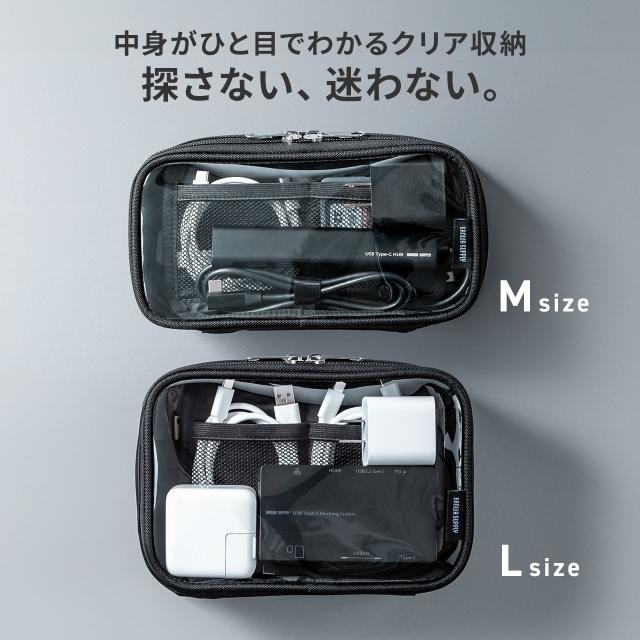 ⇒ご購入の前にご確認下さい中身がひと目で分かり、探す手間を減らせるクリア素材のガジェットポーチ。表裏ともに透明で開けずに収納物を確認できる。ダブルファスナーで大きく開き、ACアダプタやバッテリー、マウスも整理収納。出張や旅行、トラベルポーチとしても活用できる収納ケース。Lサイズ。【WEB限定商品】