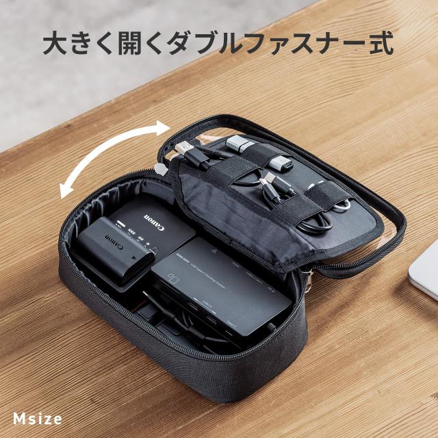 ●内部にはゴムバンドとメッシュポケットを備え、小物やケーブルを固定しながら整理収納できます。