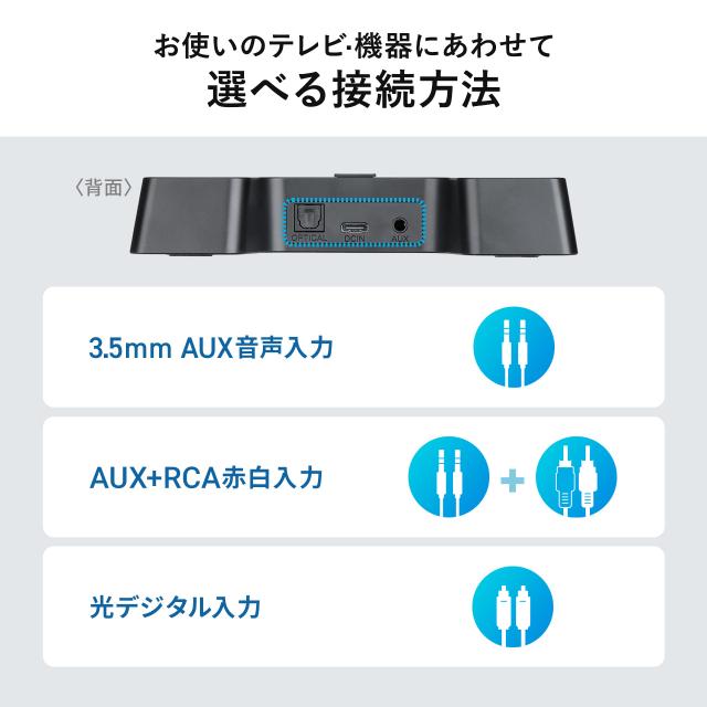 ●テレビと送信機の接続は「3.5mm(AUX)」「光デジタル」「RCA赤白端子」の3つに対応。RCAにも対応するので古いテレビや音響機器にも使えます。