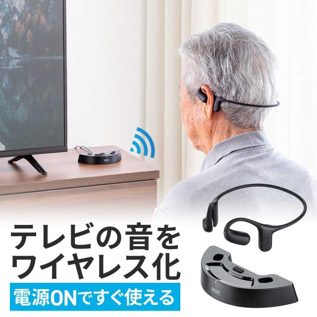ワイヤレス テレビ用 イヤホン 簡単操作 ペアリング不要 置くだけ充電 耳を塞がない オープンイヤー型 手元スピーカー ヘッドセット 低遅延 高齢者 オーディオ送信機 トランスミッター[400-BTAD014]