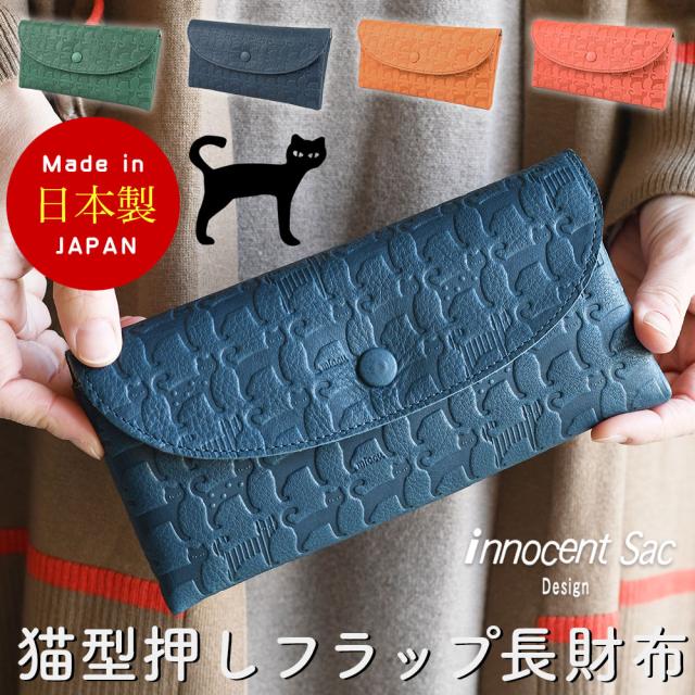 フラップ長財布 ファスナー小銭入れ レディース 日本製 本革 猫柄 ネコ柄 ネコ型押し 猫型押しレザー 牛革 エンボスレザー innocent Sac イノセントサック 姫路レザー ミャオ 薄い財布 くるみボタン 女性用 婦人用 可愛い キュート 猫好き ユニセックス