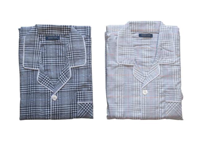 メンズ パジャマ 【夏】半袖・長ズボン チェック柄 先染めサッカーポリエステル70% 綿30% M・L ルームウェア ナイトウェア パイピング仕様 胸ポッケット付き ズボンゴム取り換え口付き 前開きなし 送料無料 コンビニ受け取りの場合は別途送料がかかります。