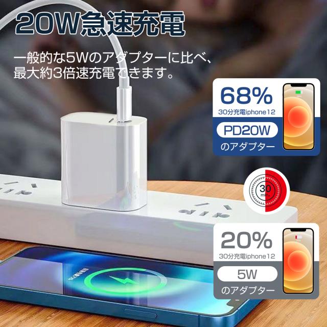 最大20W出力で、iPhone 17 / iPhone 16 / iPhone 15 / iPhone 14 / iPhone 14 Plus / iPhone 14 Pro / iPhone 14 Pro Max / iPhone 13 / iPhone 13 Pro を最速で充電可能です。 一般的な5W出力の充電器に比べ、最大約4倍の高速充電が可能です。 ※弊社の測定結果に基づく数値です。使用環境等によって数値が変動する場合がございます。