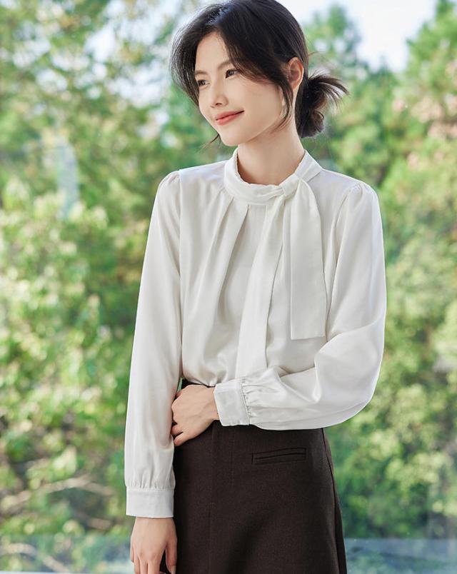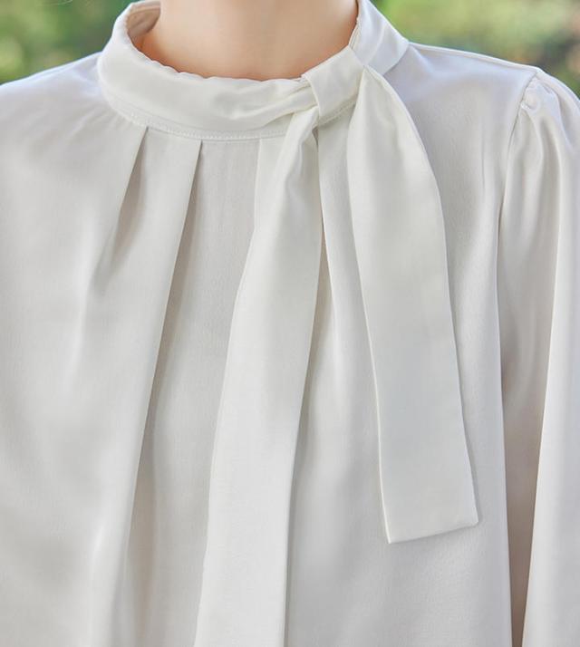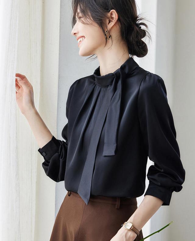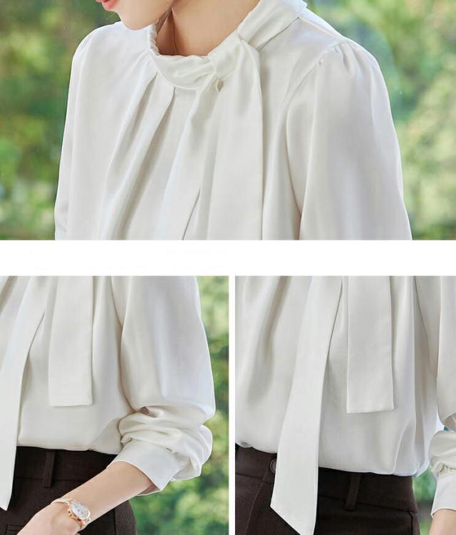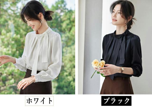 ブラウス レディース 長袖 ボウタイ 立襟 サテン シルクタッチ オフィス きれいめ 上品 事務服 入園式 卒園式 通勤 OL フォーマル 無地 トップス 大きいサイズ 小さいサイズ 春 秋 冬 黒 白 S M L 2L 3L