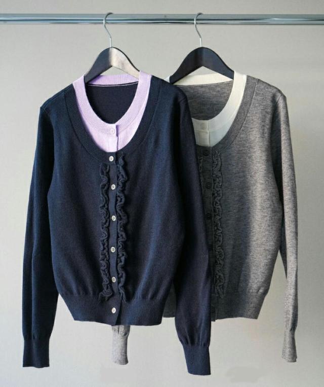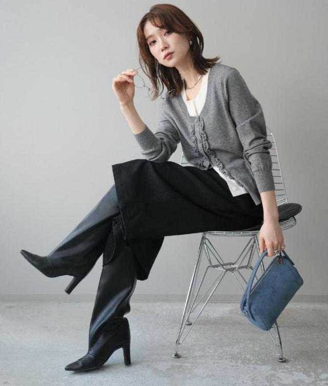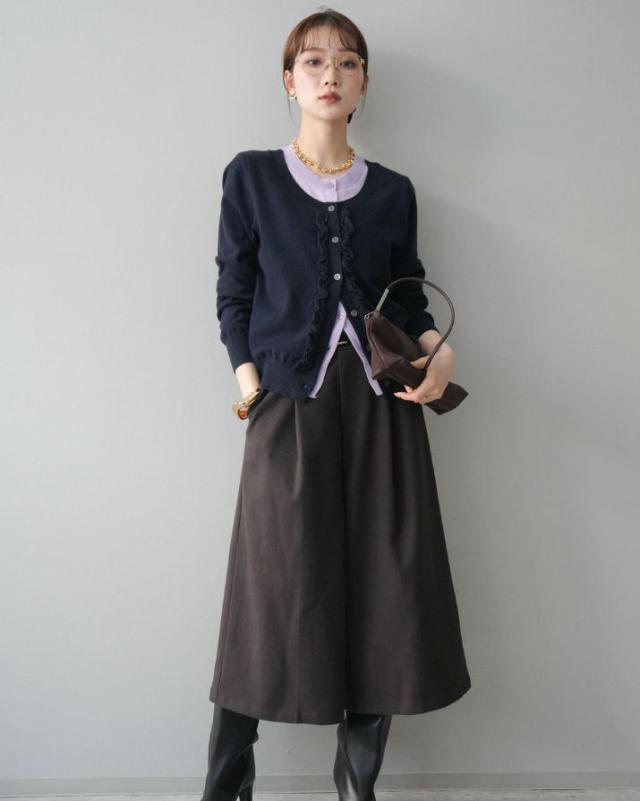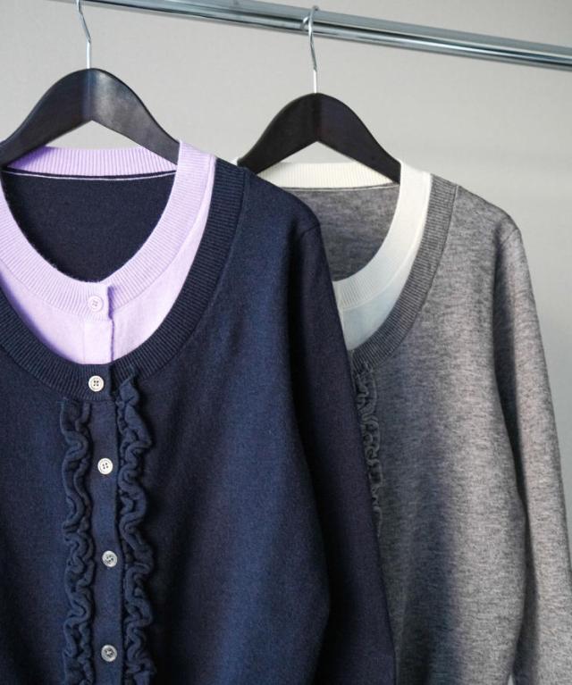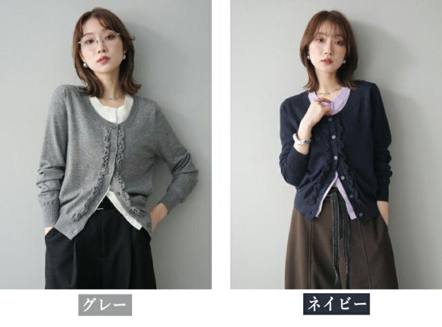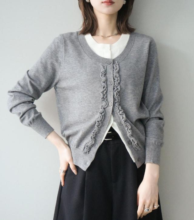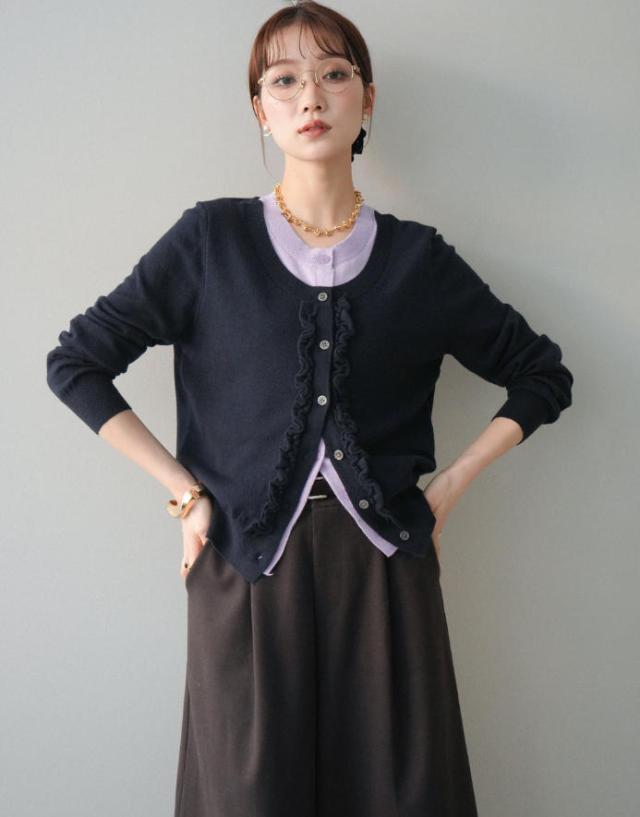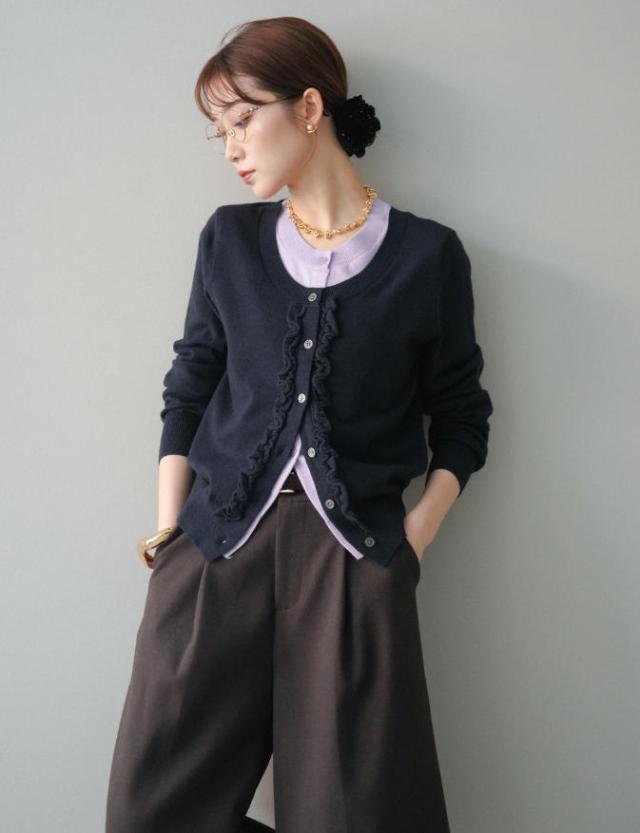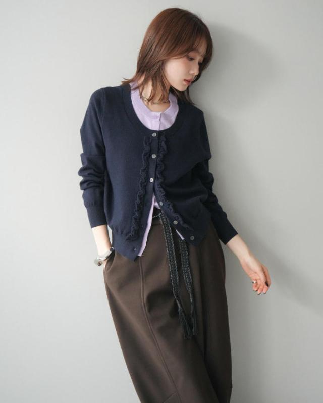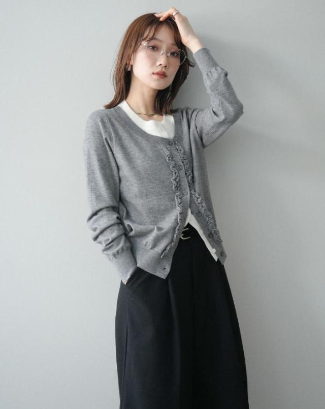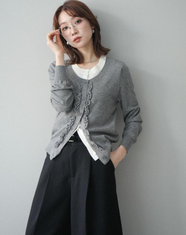 一枚で決まる、大人のレイヤードスタイル。フリルニットカーディガン。