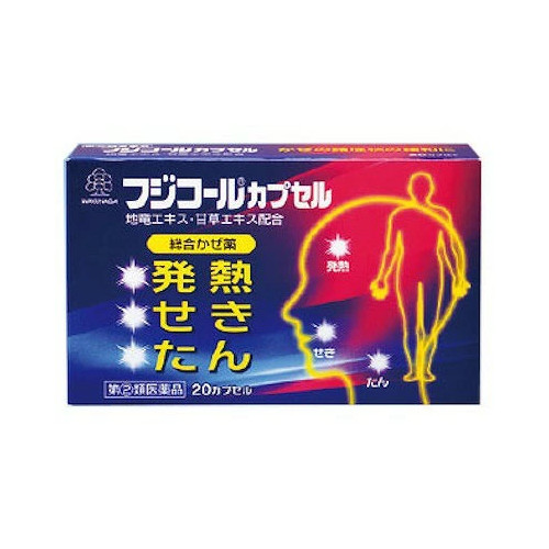 フジコールカプセルは、炎症がのどや気管に広がり苦しいせきやたんが続く時、せきをしずめ、たんをきり、気道を通りやすくする総合かぜ薬です。せきをしずめ、たんをきれやすくするチペピジンヒベンズ酸塩、解熱作用のある地竜(ジリュウ)と去たん作用のある甘草(カンゾウ)の2種の生薬に加え、かぜの諸症状に有効な5種類の成分を配合しています。