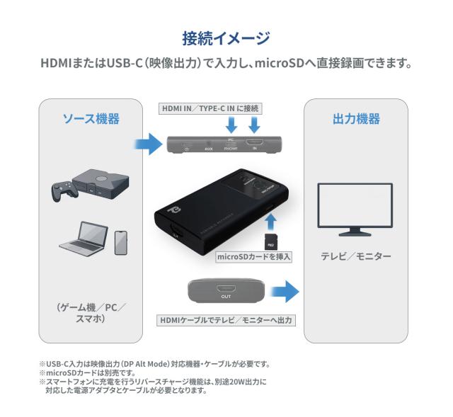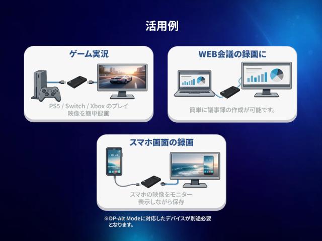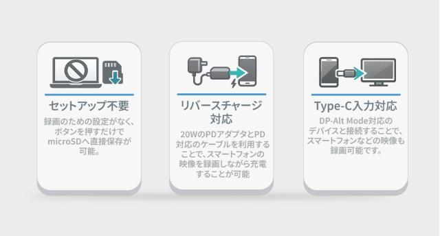 本製品は、Type-C DP-Alt Modeに対応したPCやスマートフォンと接続することでデバイスに表示される映像の録画が可能です。