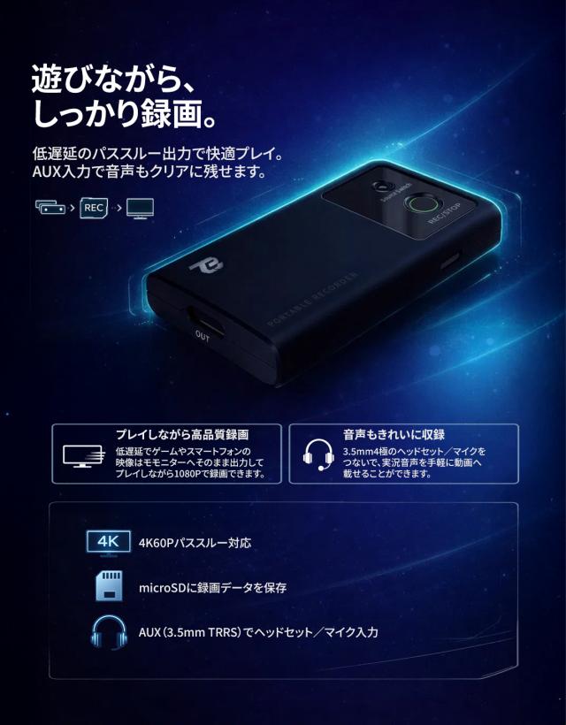 さらにAUX(3.5mm TRRS)入力に対応し、ヘッドセット/マイク音声も収録できるため、ゲーム実況やスマホ画面録画、プレゼンや会議の記録にも最適です。