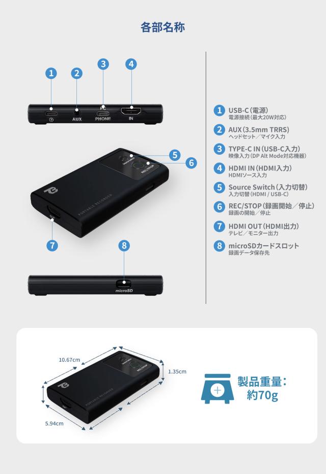 本製品は4Kの入出力に対応し、1080p60でmicroSDカードに録画データを保存できるポータブルビデオキャプチャーです。