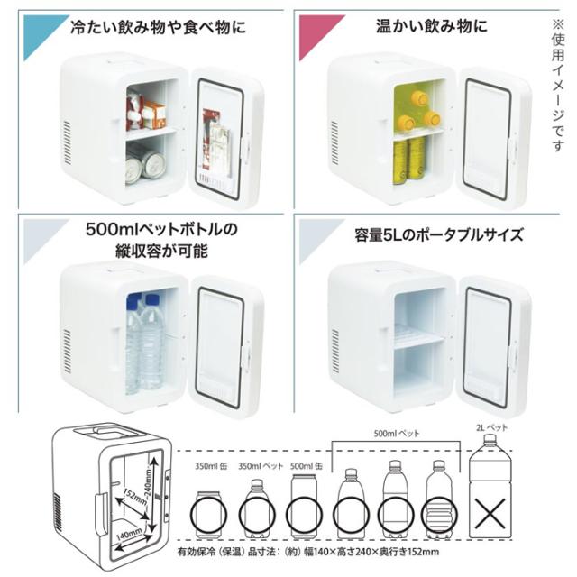 電子式保冷保温ボックス 5リットル ■電源:AC100V、DC12V ■消費電力:40W ■冷却方式:ベルチェ素子電子冷却方式 ■保冷温度目安:5℃±3℃(周囲温度25℃)※周囲温度により変動します。 ■保温温度目安:55℃±5℃(周囲温度25℃)※周囲温度により変動します。 ■使用温度範囲:5℃〜40℃ ■コード長:ACアダプター…約1.5m、DC電源コード…約2.8m ■外形寸法:(約)幅208×高さ308×奥行285mm ■庫内容積:約5リットル ■庫内寸法:(約)幅140×高さ240×奥行152mm ■本体質量:約2.6kg(※ACアダプター含まず) ■付属品:専用ACアダプター(×1)、専用DC電源コード(×1)、庫内トレイ(×1)、ドアポケット(×1)、保証書付取扱説明書 ※記載は商品仕様の一部です。仕様説明不足等の理由での返品はできません。特に適合等は必ずご確認ください。