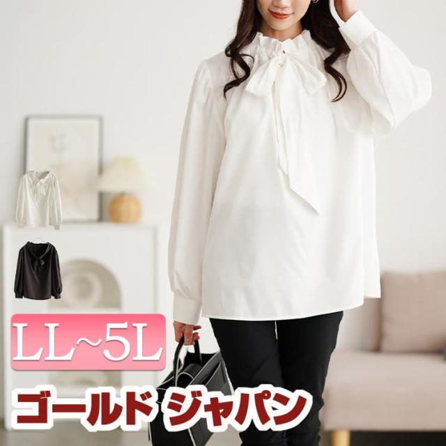 冬新作 大きいサイズ レディース トップス ブラウス シャツ リボンタイフリルカラーブラウス フリルブラウス リボンタイブラウス 長袖 リボンタイ リボン フリルカラー セレモニー フォーマル 通勤 春服 秋服 LL 2L 3L 4L 5L ブラック 黒 オフホワイト 白 ゴールドジャパン