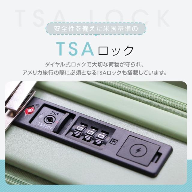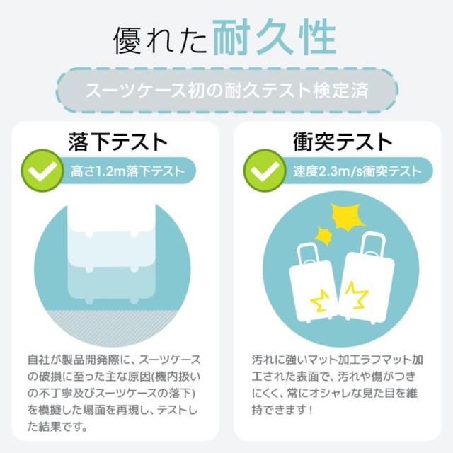 表面素材は高耐衝撃性を持つPC(ポリカーボネート)を100%使用。高弾性で、変形しにくい。ABS素材を採用した市販品より頑丈で耐久性に優れ、ABS+PCスーツケースより軽量で持ち運びやすい。PC 素材は、現在市場で最も一般的に使用され人気のあるハードシェル ラゲッジであり、防水性、耐摩耗性、スタイリッシュさ、耐衝撃性、落下耐性を備えています。世界基準のTSAダイヤル式ロックが搭載されて、外出がより安全に。※鍵は航空会社検査専用のため本製品には付属していません。