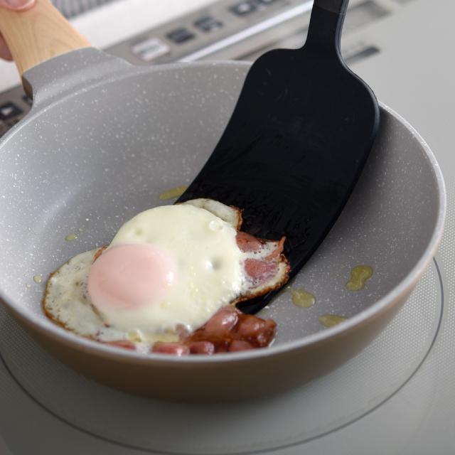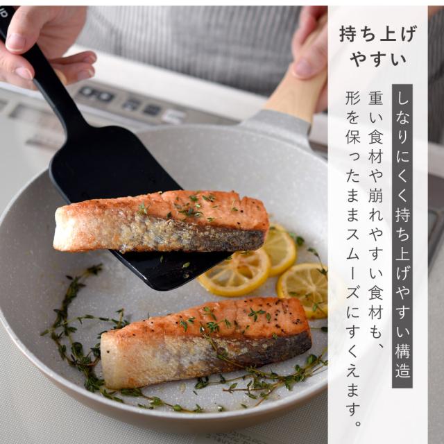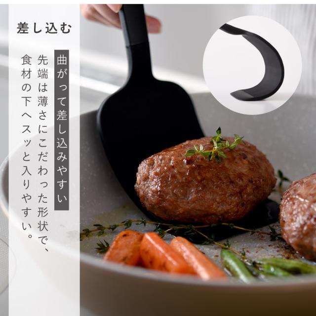 先端は薄さにこだわった形状で、食材の下へスッと入りやすいのが特長。深さのある調理器具でも扱いやすく、手元が安定して操作しやすい設計です。