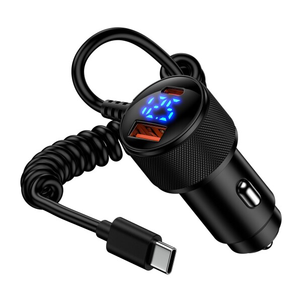 Vedfoad カーチャージャー iPhone17 78W 3台同時急速充電 PD/QC3.0対応 LED電圧表示 シガーソケット USB-A&USB-C 車載充電器 1.2m 30W Type-C コイルケーブル付き 12V/24V車対応 iPhone17、16シリーズ/iPad/Galaxy/G