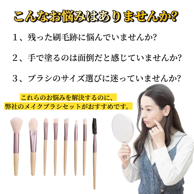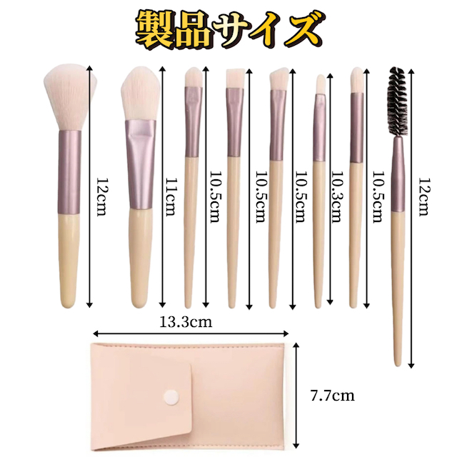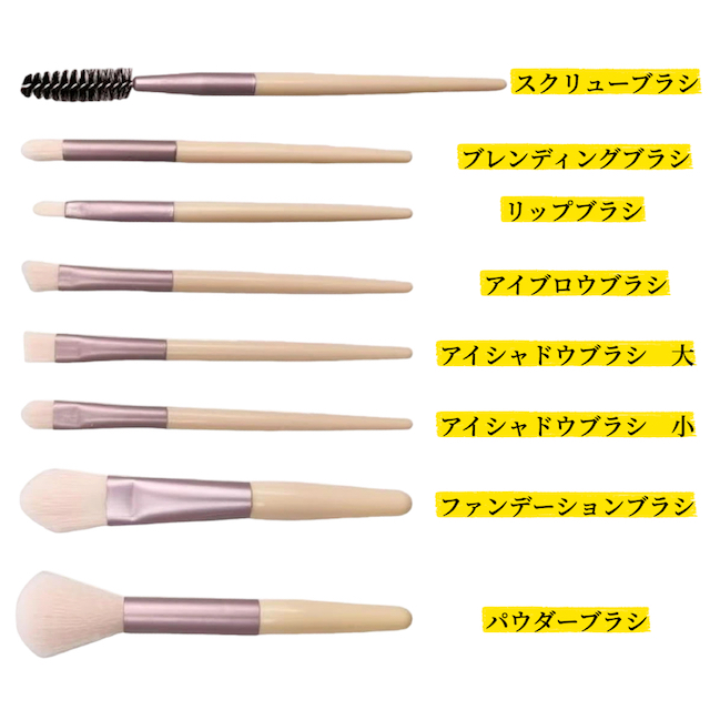 | 商品内容 | スクリューブラシx1、リップブラシx1、アイブロウブラシx1、ブレンディングブラシx1、アイシャドウブラシ 大x1、アイシャドウブラシ 小x1、ファンデーションブラシx1、パウダーブラシx1。 |
