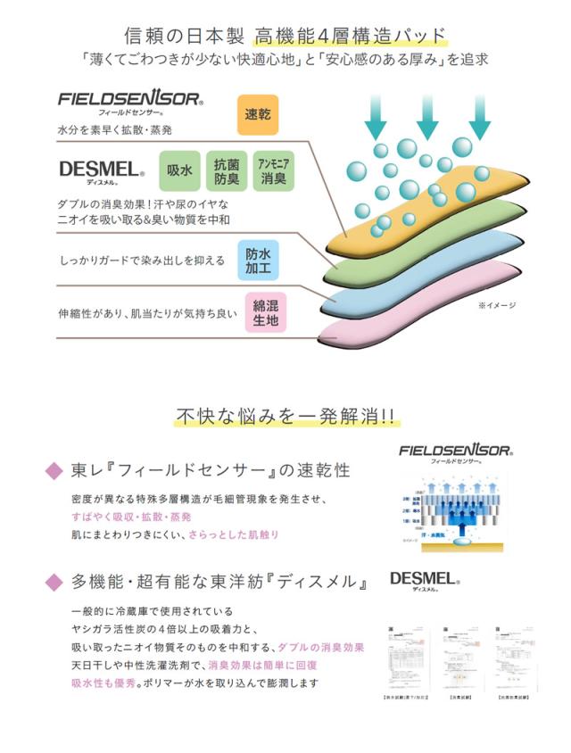 速乾・抗菌防臭・アンモニア消臭・吸水・防水、吸水部は4層構造高機能パッド