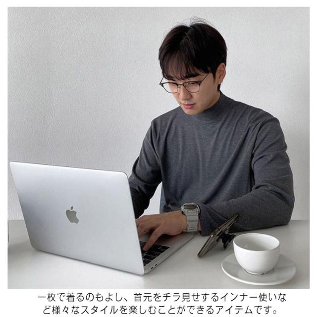 | 両面起毛で暖かい!モックネックtシャツ 両側を起毛させることであたたかく過ごせる保温性があり、ほっこり快適な着心地。 ストレッチ性があるので、ストレスフリーに着用していただけます。 一枚で着るのもよし、首元をチラ見せするインナー使いなど様々なスタイルを楽しむことができるアイテムです。 どんなアイテムにも合わせやすいデザイン。カジュアルなパンツにも、キレイめなスラックスなどにもOKな万能アイテムです。 | |