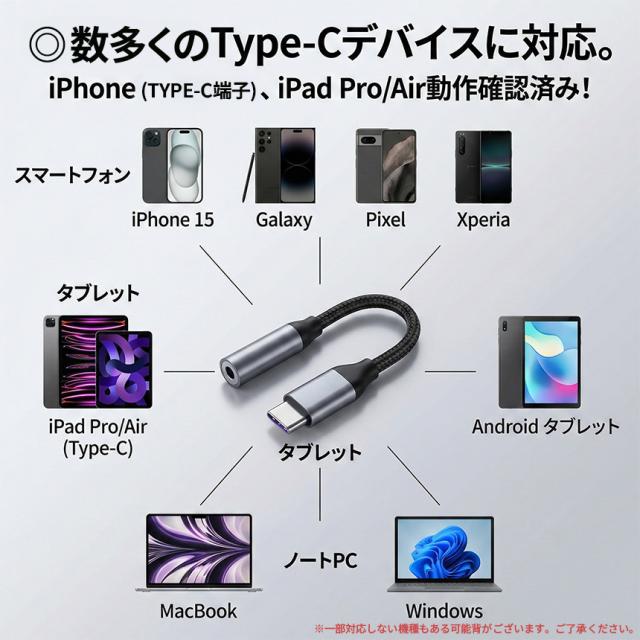 iPhone 15シリーズをはじめ、Galaxy、Pixel、Xperiaなどの最新Androidスマートフォン、iPad Pro/Air(Type-Cモデル)、さらにMacBookやWindowsノートPCなど、USB Type-Cポートからの音声出力に対応したデバイスで幅広くご使用いただけます。