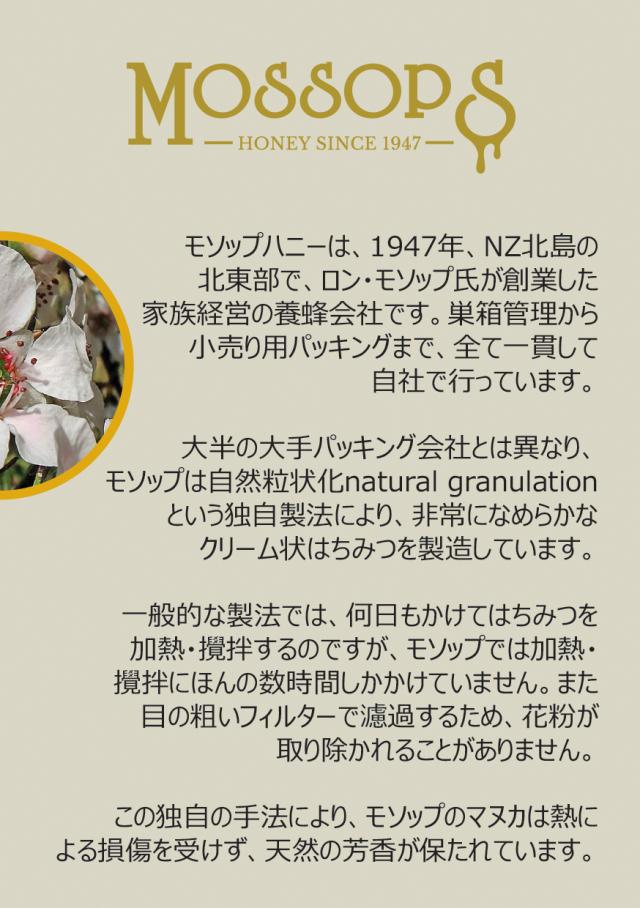 ◆モソップハニー社は三世代続く家族経営の養蜂場で、NZ北島タウランガ市に1947年に創立されました。巣箱管理から小売り用パッキングまで、一貫して自社で行うはちみつ生産会社です。「モソップ」はモソップ家の名字です。