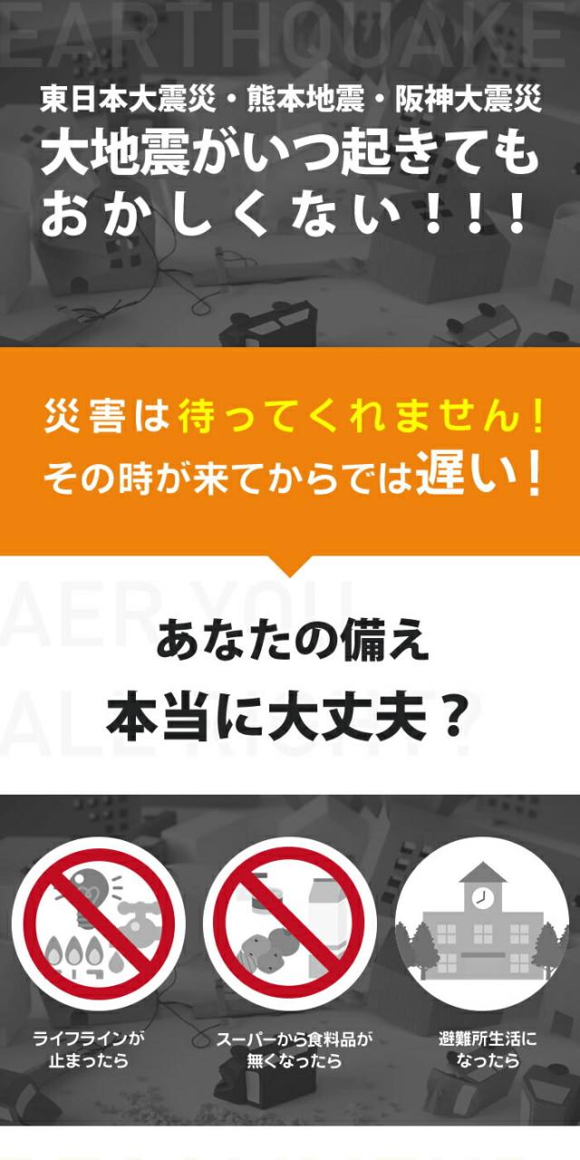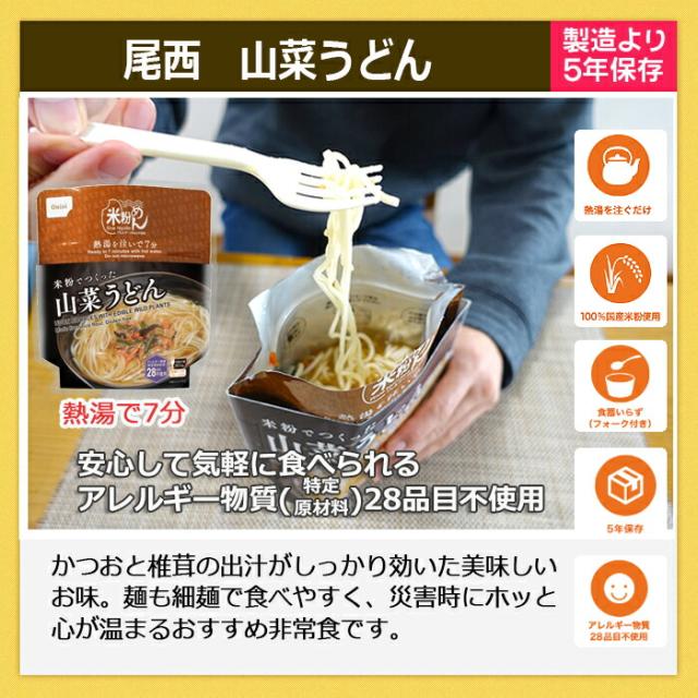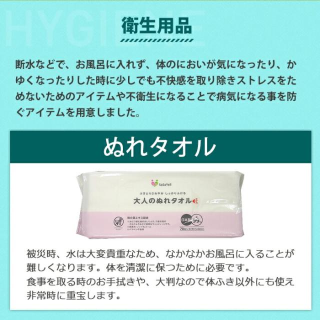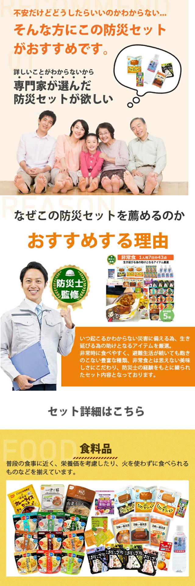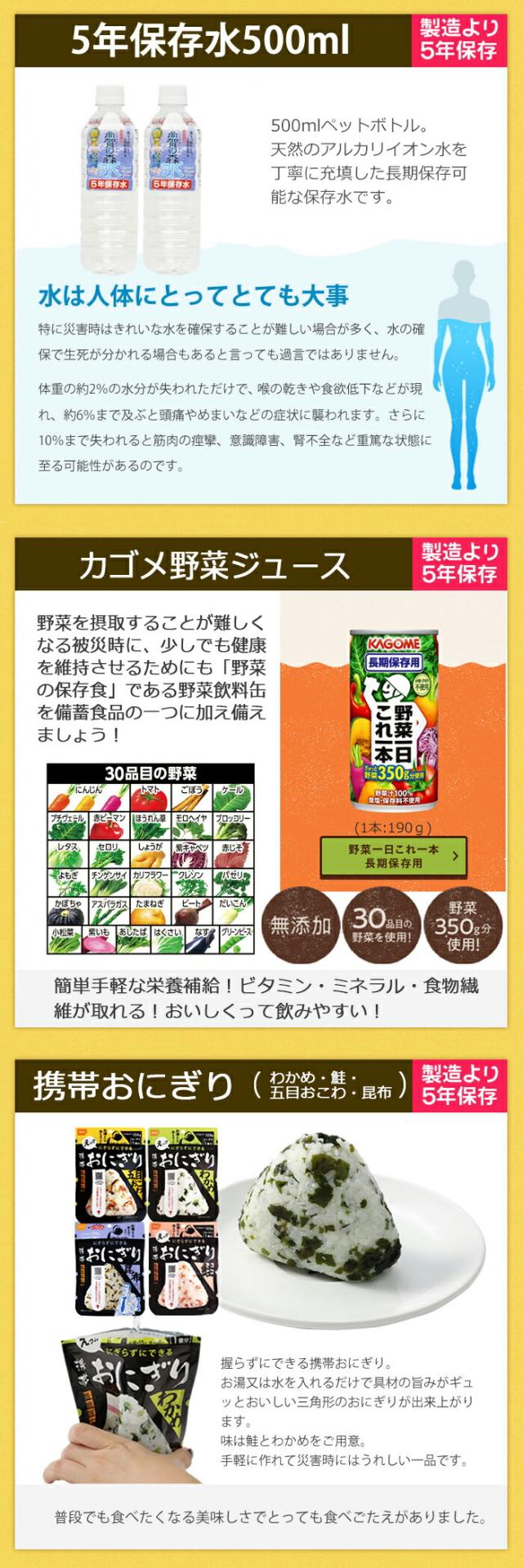 こちらは非常・保存食31種類43点セットのページです。 生き延びる為の助けとなるアイテムを厳選。 おひとり様、約7日分の非常食として。分けあってご家族分として。 すでに備蓄されている場合も、賞味期限の近いものの詰め替え用として。キャンプ、アウトドアでの使用に。 お友達、ご近所様と分け合い。企業様、自治体などの備蓄用に。 製造より5年保存可能!※スープとゼリーを除く ※流通の段階で多少のお時間がかかるため、お手元に届く際には賞味期限が5年を切る場合もございます(賞味期限4年以上を保証) ごはん、おにぎりは、お湯で約15分、水で約60分でおいしいごはんが出来上がり。 すべて国産米を使用し、非常用持ち出し袋などにセットしたり、キャンプなどでもお使いいただける美味しく手軽なごはんです! 袋入りパンもふんわりおいしく、避難先で心が安らぐクッキー、ゼリーなどのおやつも入っています。 ライスクッキーはパティシエ監修で、非常食とは思えないおいしさです! 非常用持ち出し袋の中に追加したり、ご家族用にご用意される時にぴったりの単品販売となります。 アウトドア、キャンプでもお使いいただけます! -セット内容- 1-7 5年保存水 ×7 8-14 野菜ジュース ×7 15-18 携帯おにぎり ×4 (わかめ、鮭、五目おこわ、昆布) 19-27 サタケ マジックライス ×9 (白飯、わかめご飯、青菜ご飯、梅じゃこご飯、根菜ご飯、五目ご飯、ドライカレー、野菜ピラフ、チャーハン) 28-30 ひだまりパン ×3 (プレーン、チョコ、メープル) 31 美味しい防災食 豚汁 ×1 32 美味しい防災食 ハンバーグ煮込み ×1 33 美味しい防災食 肉じゃが ×1 34 ココイチ カレーライスセット ×1 35 一汁御膳 けんちん汁セット ×1 36 山菜うどん ×1 37 ゼリーdeサプリ まいにち果物+鉄 ×1 38-40 カラダにやさしいスープ アソート ×3 41 ライスクッキー ココナッツ ×1 42 からだふき ×1 43 5L給水バッグ ×1 総合計43点のセットとなります。 ■原産国:日本 -ご注意- ■災害発生後はご注文が非常に殺到いたします。納期にお時間をいただく場合がございます。セット内容は予告なく、同等の品に変更になる場合がございます。 また、発送・お問い合わせのご返答にはお時間を頂戴いたします。ご了承ください。 ■商品サイズ・カラーは、企画サイズとなります。 ■商品画像につきましては、モニターの種類・設定等により、実際の商品とは素材感や色味が異なる見え方をする場合があります。 ■細かなキズや、製造上避けられないシミ・シワなどがある場合があります。 ■商品仕様は、予告無く仕様変更される場合がございます。また、セット内容は予告なく同等の品に変更になる場合がございます。予めご了承下さい。 ■商品によっては、他店と在庫共有しているものがございますので、ご注文を頂戴した時点で、 在庫が確保できない商品につきましては、 ご注文をキャンセルさせていただく場合がございます。 なにとぞ、ご了承の程、よろしくお願いいたします。 |
