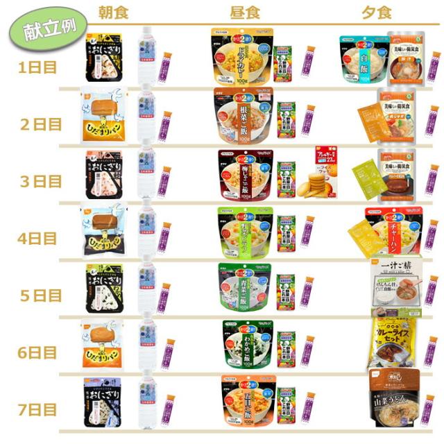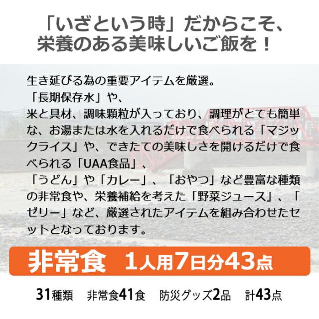 非常食 43点セット 7日分 31種類 防災 セット 水 中身だけ ごはん おにぎり 5年保存 給水バッグ 詰め替え用 備蓄用 防災グッズ 保存食 災害 地震 防災用品 避難グッズ 避難用品 キャンプ アウトドア カレー うどん ゼリー パン アルファー米 【5-7日】