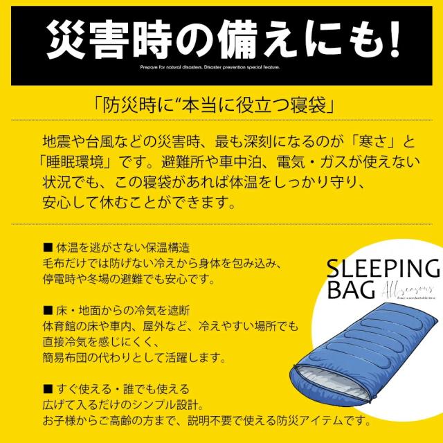 オリジナルブランド リーベンシリーズより防災・アウトドアで活躍する寝袋が登場! 就寝時に落ち着くネイビーカラー。 キャンプや車中泊はもちろん、オフィスでの仮眠や防災時まで幅広く活躍する封筒型寝袋です。 軽量で扱いやすく、初めての方からベテランまで使いやすい設計にこだわりました。 中綿には中空ポリエステルを採用。 繊維の中に空気を含む構造のため、軽さと保温性を両立し、ふんわりと体を包み込みます。 首元にはドローコード付き。 絞ることで寝袋全体が体にフィットし、冷気の侵入を防ぎ、より暖かく快適に使用できます。 ダブルジップ仕様なので、内側・外側どちらからでも開閉が可能。 温度調整がしやすく、寝袋に入ったままの操作もスムーズです。 ファスナー部分にはファスナーガードを装備し、ファスナーが勝手に開くのを防止。 細部まで拘り抜いた設計になっています。 重さはわずか約950gの軽量設計。 持ち運びや収納もラクで、女性やお子様にも扱いやすい寝袋です。 キャンプ・車中泊・来客用・オフィス仮眠・防災備蓄など、 1枚あれば様々なシーンで活躍する万能寝袋としておすすめです。 ■全体サイズ:約200cm×約75cm(ファスナー開閉時:約200cm×約150cm) ■袋に入れた際のサイズ:約38cm×19cm ■素材:表面・裏地:ポリエステル100%/中綿:中空ポリエステル100% ■重量:約950g ■生産国:中国 -ご注意- ■お客様都合(イメージ違い)、ご使用に問題の無いキズ・汚れ等による返品交換は承っておりません。 ■商品サイズ・カラーは、企画サイズとなります。 ■商品画像につきましては、モニターの種類・設定等により、実際の商品とは素材感や色味が異なる見え方をする場合があります。 ■細かなキズや、製造上避けられないシミ・シワなどがある場合があります。 ■商品仕様は、予告無く仕様変更される場合がございます。セット内容は予告なく同等の品に変更になる場合がございます。予めご了承下さい。 ■アウトレットにて販売しております。アウトレットの訳有り品として ・多少の傷や汚れがある ・チャックが少し固い ・縫製が少し甘い ・縫製のラインが少し歪んでいる ・ミシンで縫いすぎて糸をほぐした跡がある ・梱包には再利用箱を利用している ・タグのついていない商品がある ・多少のにおい等(接着剤やクリーニング液)が残っている ・その他ご使用に問題のない物等など といった上記の状態の商品が含まれている場合がございます 予めご了承願います。 ■アウトレット商品に関しましては国内での検品は一切しておりません。 ■商品によっては、他店と在庫共有しているものがございますので、ご注文を頂戴した時点で、 在庫が確保できない商品につきましては、 ご注文をキャンセルさせていただく場合がございます。 なにとぞ、ご了承の程、よろしくお願いいたします。 |
