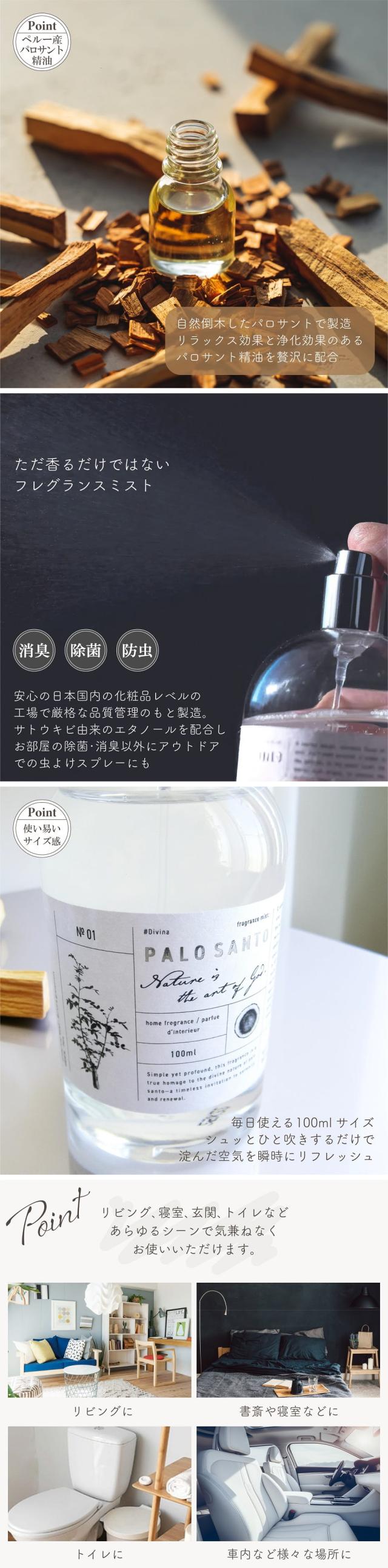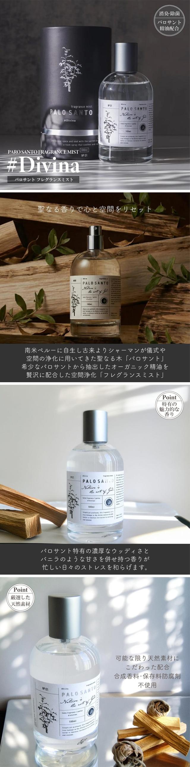 アロマ アロマスプレー Divina ディヴィーナ パロサント フレグランスミスト 100ml 日本製 パロサント精油配合 オーガニック ウッディ&グルマン系 香木 浄化 リラックス 消臭 除菌 防虫 アロマミスト アロマスプレー フレグランス 芳香 いい香り おしゃれ ギフト