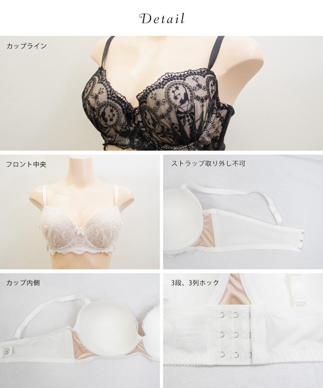 裏地無し、透け感有り、伸縮性有り 【カップタイプ】3/4カップ・モールドカップ(丸みを形成した厚みのあるカップです)、【ホックの数】3段3列、【パット付属】なし、【パットポケット】なし、【ストラップ取外し】不可、【ワイヤー】あり、※タンブル乾燥禁止
