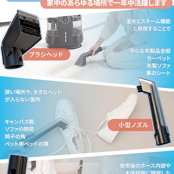 ・【1台2役の多機能モデル】リンサーヘッドに加えスチーム用アタッチメントも付属。ソファ、車内からキッチン周りまで家中これ1台。
