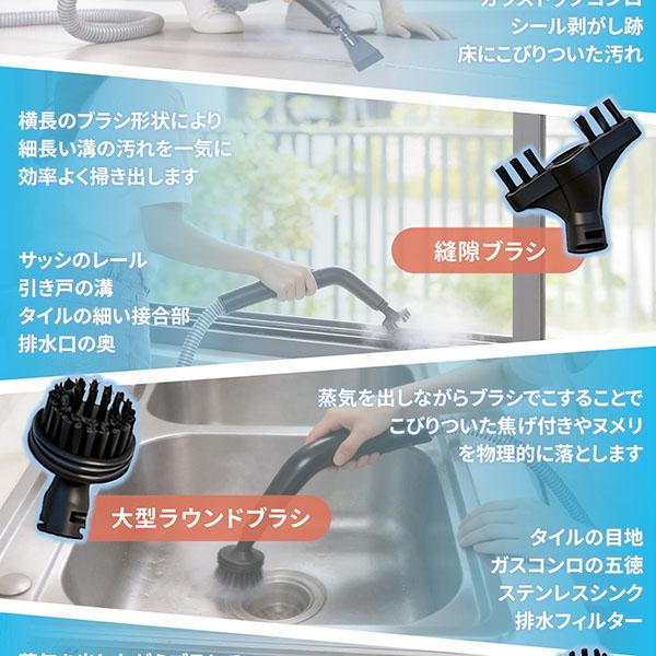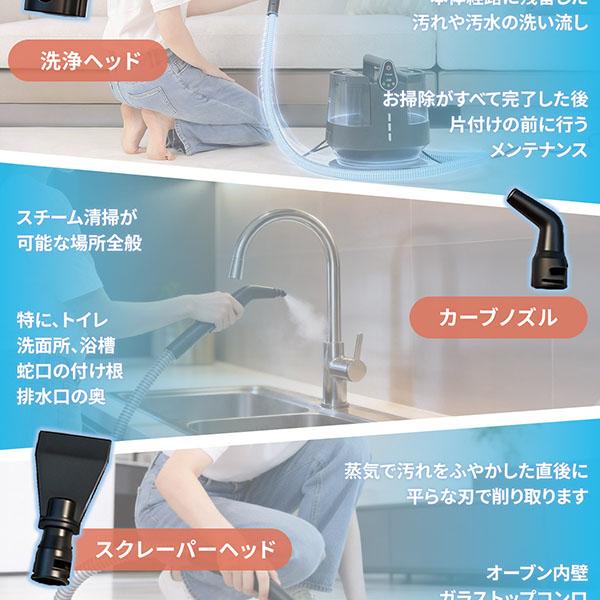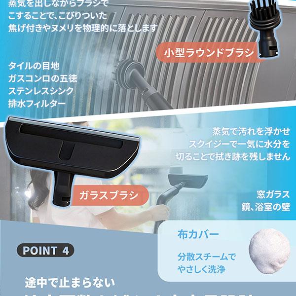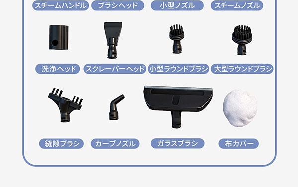 | 付属品 | A.本体、 B.ノズルハンドルホルダー、 C.ホース、 D.スチームハンドル、 E.ブラシヘッド、 F.小型ノズル、 G.洗浄ヘッド、 H.スチームノズル、 I.スクレーパーヘッド、 J.大型ラウンドブラシ、 K.小型ラウンドブラシ、 L.縦刷ブラシ、 M.カーブノズル、 N.ガラスブラシ、 O.布カバー、 取扱説明書兼保証書 |