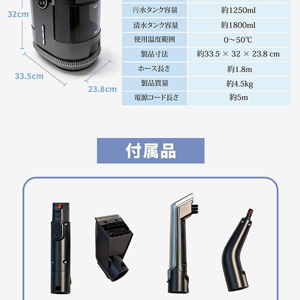 定格電圧:AC100V 50/60Hz 定格入力:1500W 吸引力:最大18000Pa 設定温度:常温 / 40℃ / 60℃ / 100℃(スチーム) NTC温度センサー200℃、二重温度ヒューズ216℃ 清水タンク容量:約1800ml (MAX線まで) 汚水タンク容量:約1250ml (満水検知機能付) 製品寸法:約33.5 × 32 × 23.8 cm (本体のみ) 製品質量:約4.5kg ホース長さ:約1.8m 電源コード長さ:約5m 主な機能:日本語音声ガイダンス、4段階温度切替、3段階吸引力調整、キャスター付 |