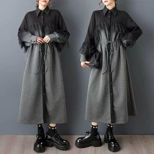 スウェットワンピース 前開き レディース ロング 長袖 モード レース チュール シャツワンピ ロング 無地 個性的 ウエスト調整 モード系 pLegLad ドレープ ワイド 体型カバー 春 秋 冬 20代 30代 40代 50代
