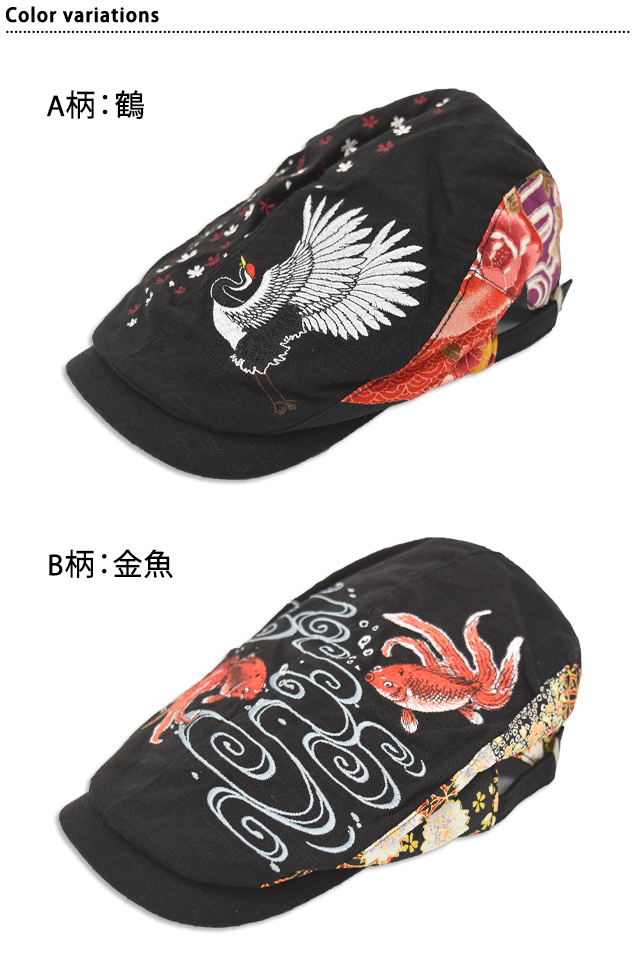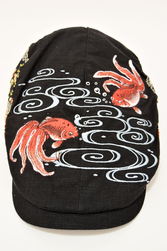 和柄刺繍ハンチング リップル H32-SH15,16 帽子 鶴 金魚 ユニセックス